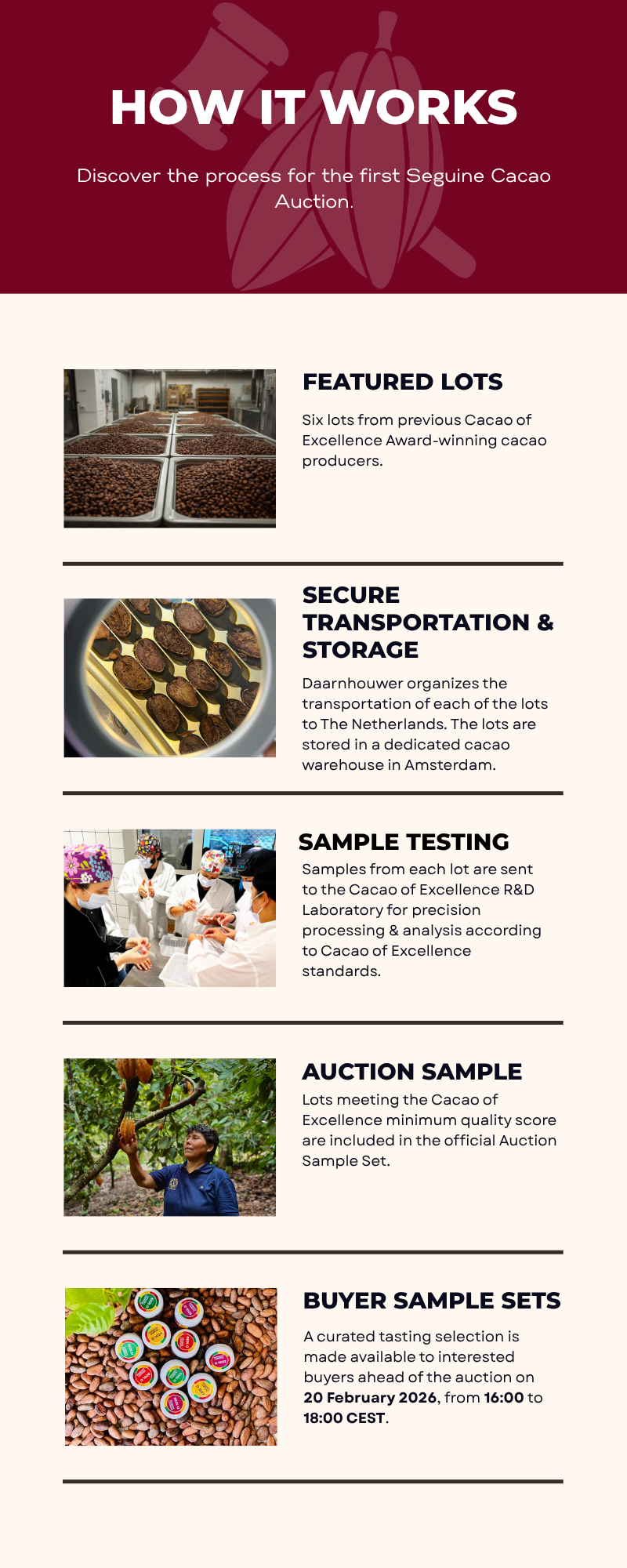 The first Seguine Cacao Auction unveils a curated collection of exceptional cacao lots from across the world, each meticulously evaluated for flavour, consistency, and potential in fine chocolate.