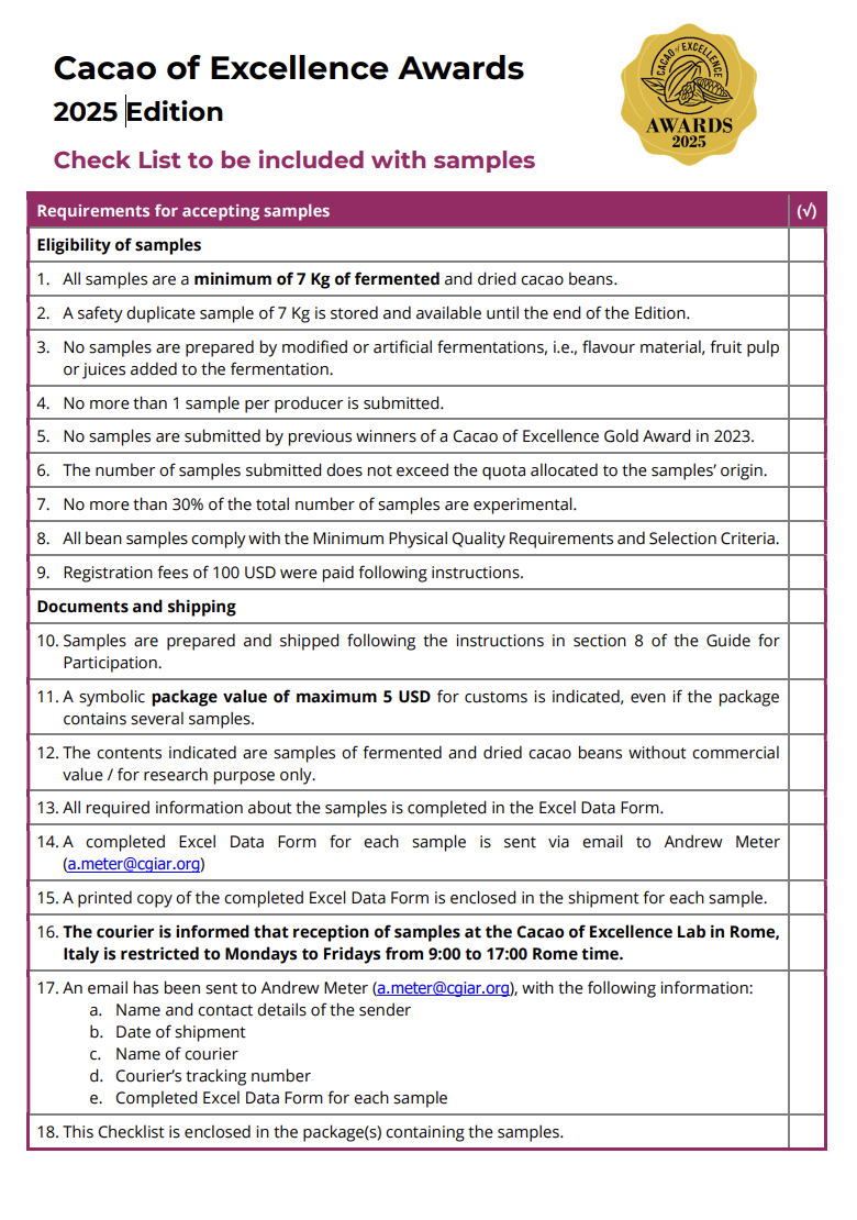 Cacao of Excellence is pleased to share all of the important information regarding the shipping of cacao samples plus associated documentation for the 2025 Edition of the Cacao of Excellence Awards. These process should be well coordinated with the National Organisation Committees in your origin.