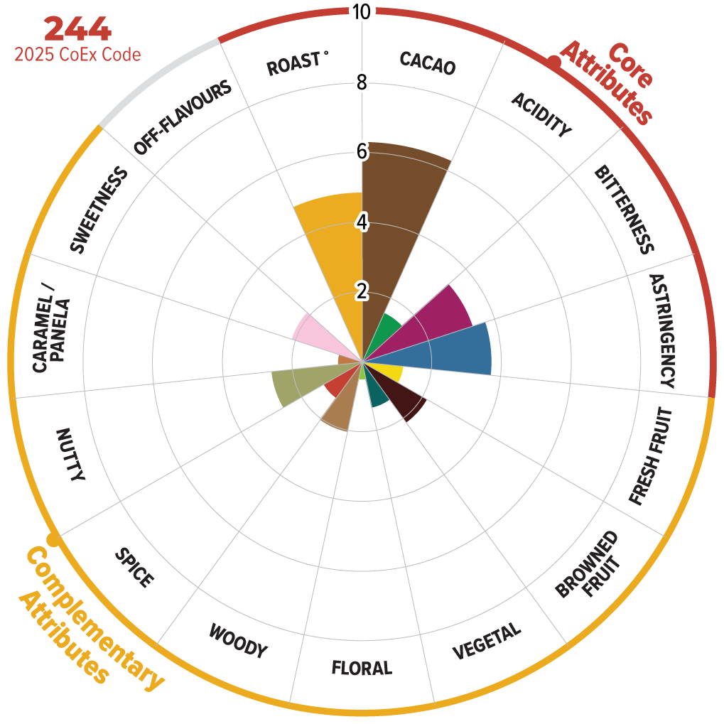 A complex chocolate with a solid roasted cacao base, moderate bitterness and astringency, and low acidity. Notes of browned fruits, clear wood and spices accompany a persistent and very intense cacao aftertaste.