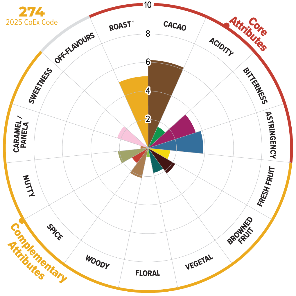 This chocolate has an intense cacao base. It shows moderate fresh red fruits and browned fruits, clear roasted nuts and spices or tobacco, with a long woody finish.