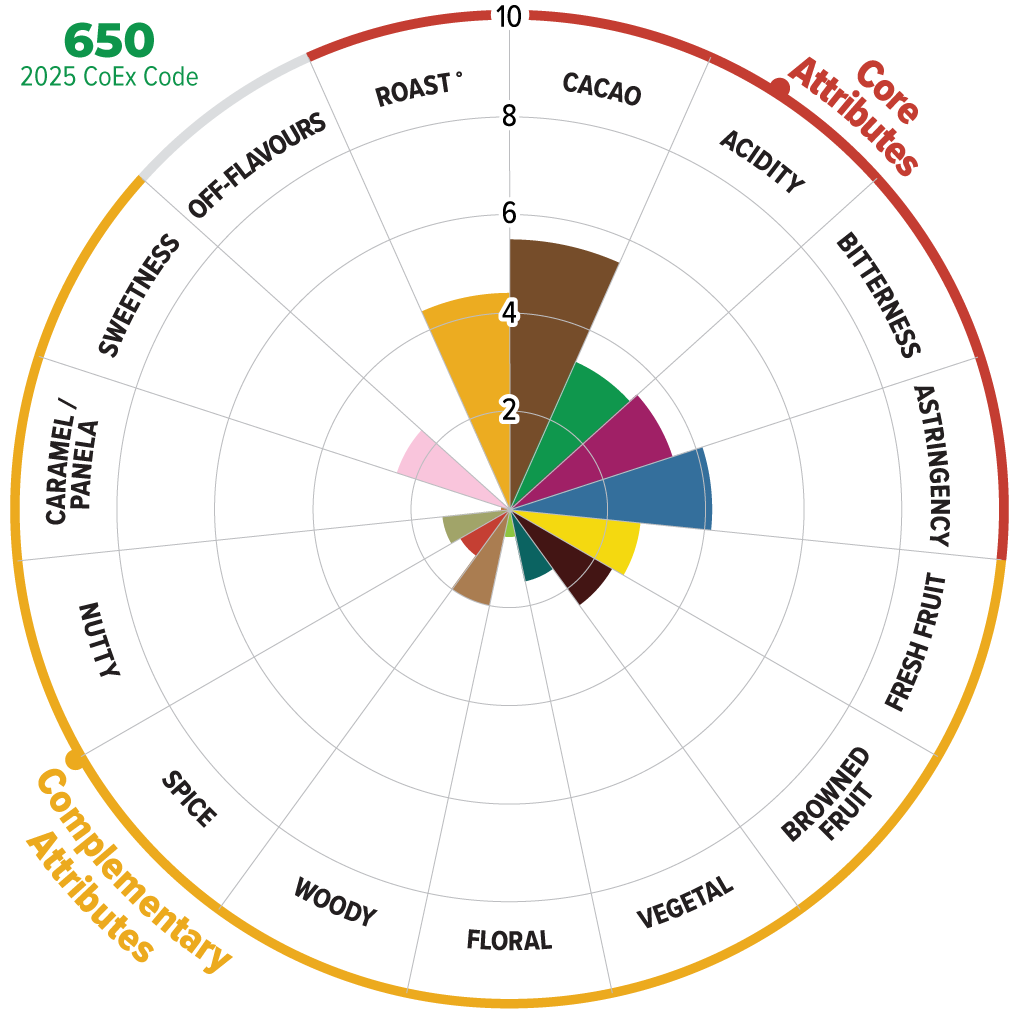 This chocolate shows high acidity and astringency with fresh tropical and citrus fruits and strong browned fruit notes. Vegetal and dark wood follow, leading to a strong cacao finish with spices and nuts.