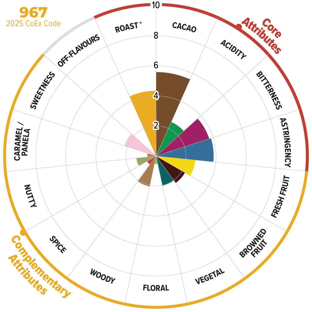 This sample starts on a moderate to high cacao base and develops browned and fresh fruits, herbal and woody notes, with hints of nuts and spices. Balanced throughout.